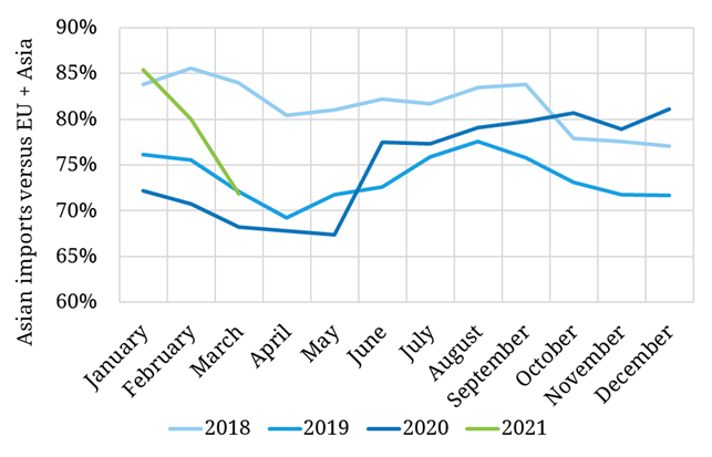 This chart illustrates well the extent of market tightness in Jan 2021 (above levels seen in 2018, the last time prices jumped).  It also shows relative weakness in Mar 2021, with Asia’s share declining to 72%.
