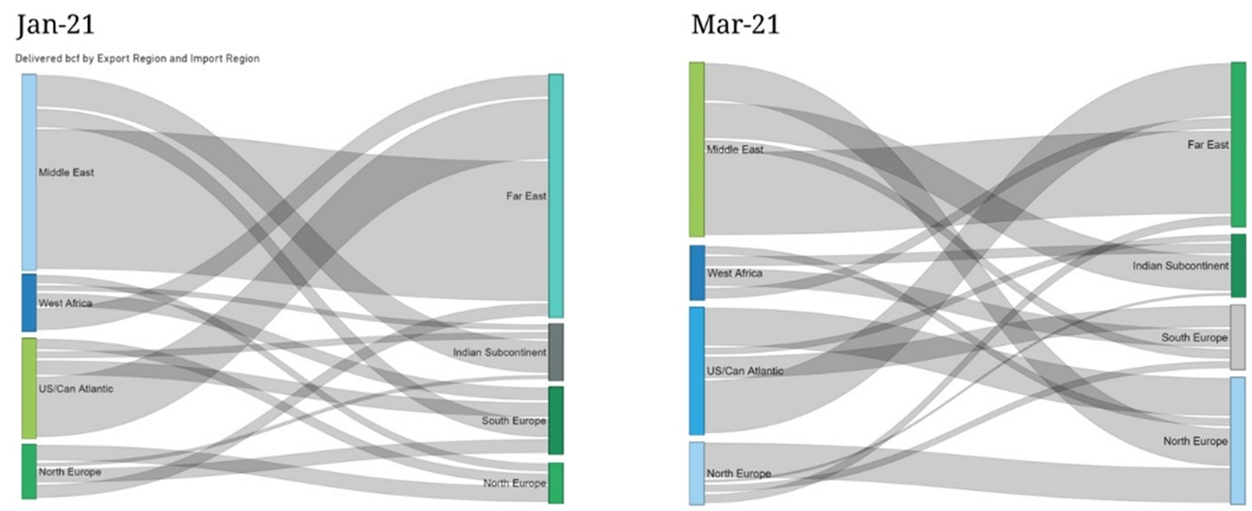 Chart 3: Aggregated global LNG flow diagrams for Jan & Mar 2021