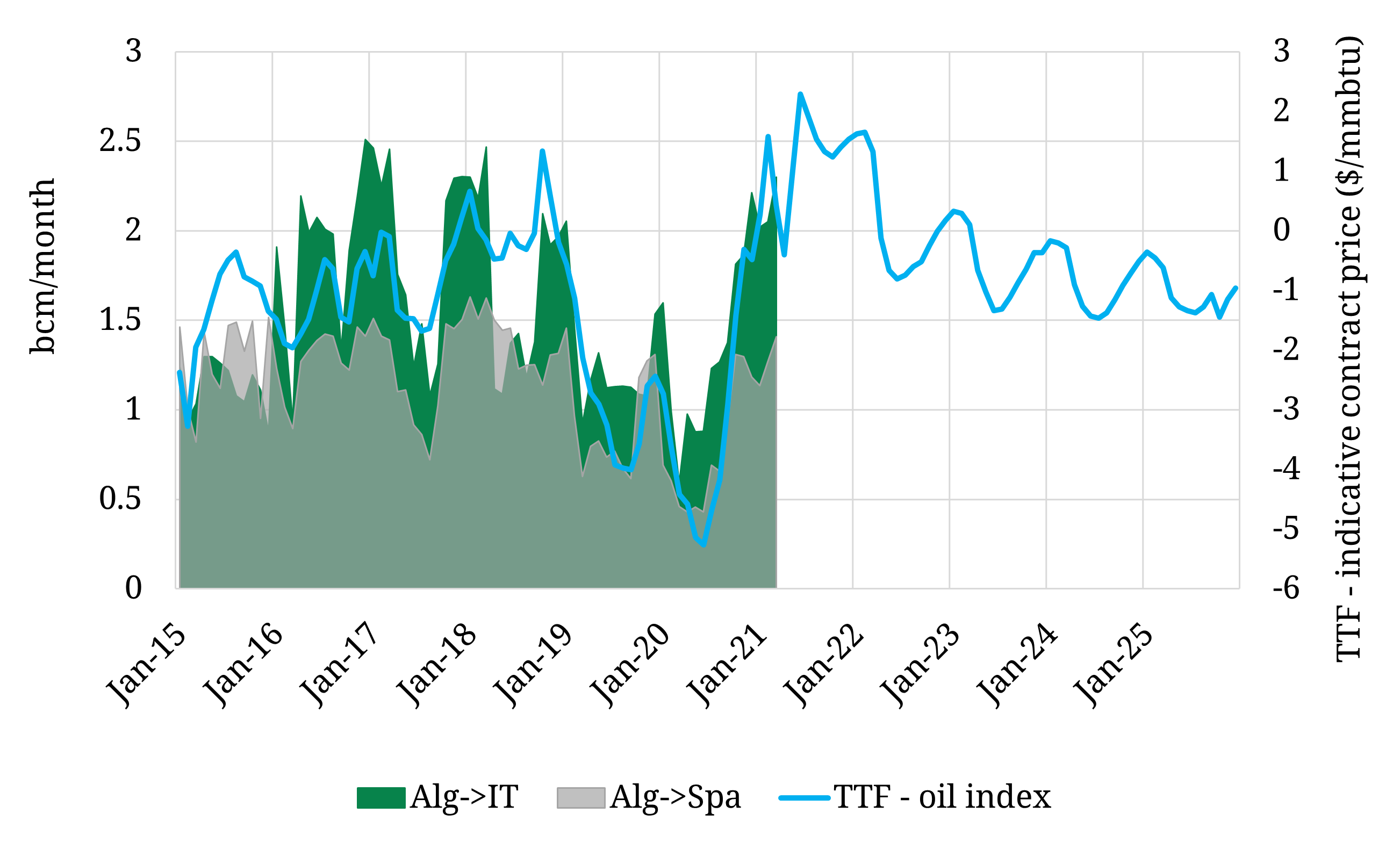 Chart 1: Algerian flows to Italy & Spain vs the TTF – indicative oil-indexed contract price spread