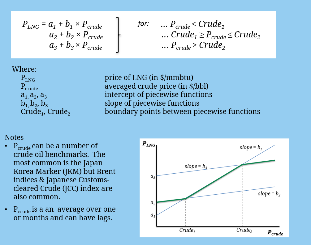 A key component of these price formulas is the slope coefficient that determines the relationship between movements in the price of crude and the LNG contract price.  This can often have an ‘S curve’ incorporated where the slope coefficient changes at different levels of crude price.  The relationship to crude prices can also be impacted by time lags and averaging.