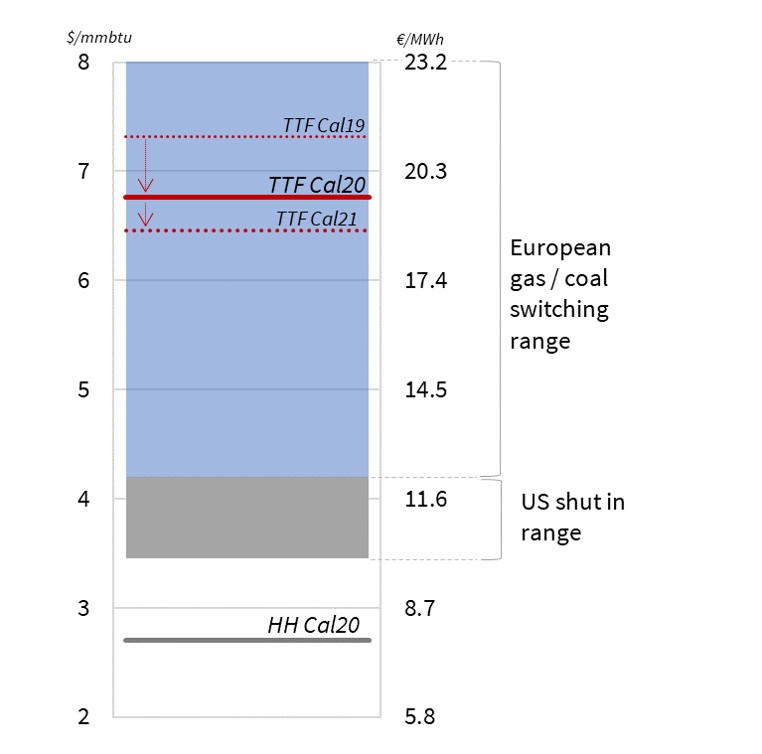 For example, a fall in gas prices from the 2019 forward price level (7.3 $/mmbtu, 21.2 €/MWh) to the ‘shut in’ range (4.2 $/mmbtu, 12.2 €/MWh) yields about 30 bcma of incremental switching demand, assuming coal (& carbon) prices are constant.