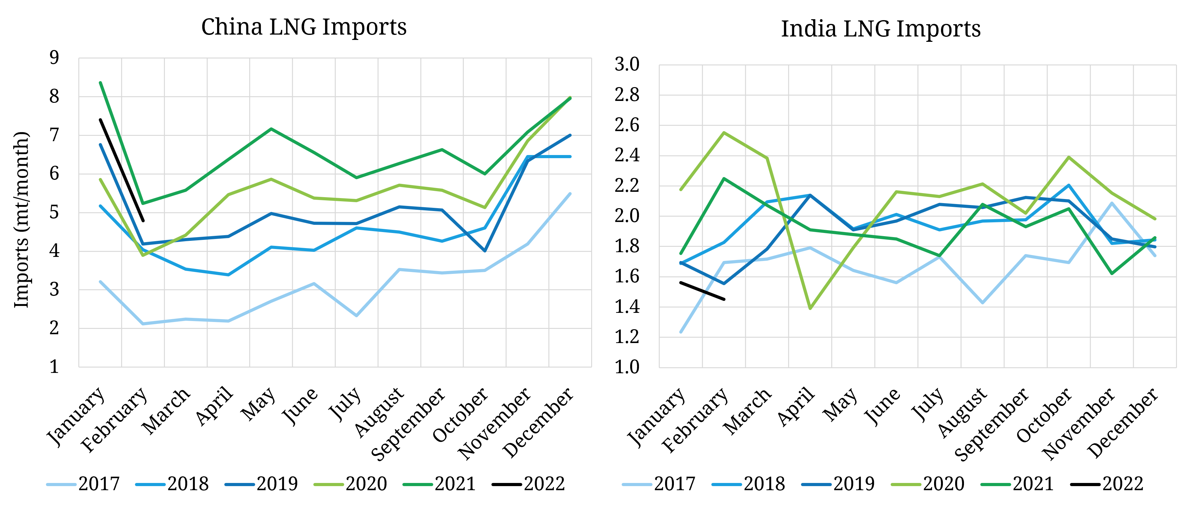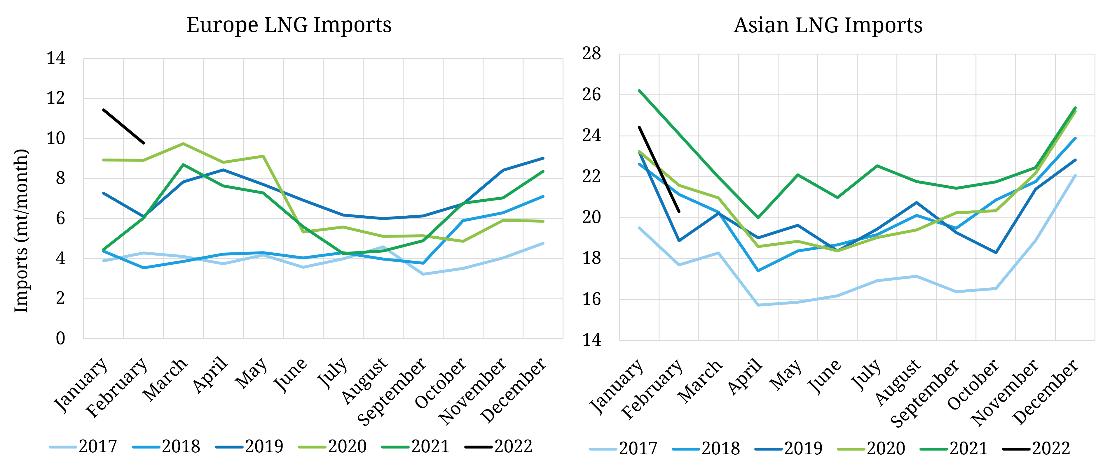 Chart 1: European & Asian LNG monthly imports (2022 vs previous 5 years)