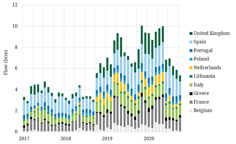 That trend has reversed sharply in 2020. The Covid demand shock and acute temporary oversupply in the LNG market has seen surplus cargoes flooding into Europe this year. This has driven hub prices down to historically low levels and Russian import volumes have fallen in response, down more than 20% vs 2019 across Q1 – Q3 2020.
