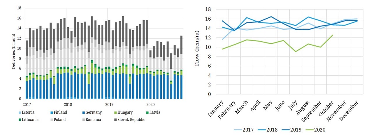 These charts do not show flow volumes to Turkey (e.g. via Bluestream and the new Turkstream pipeline), which have seen a sharp decline in 2020 as buyers sourced cheap LNG as an alternative.