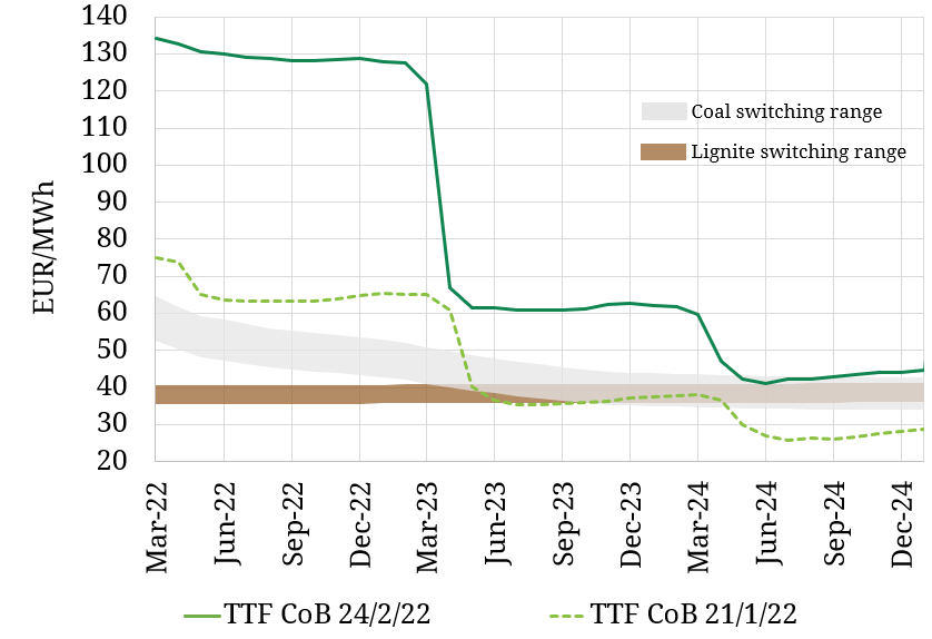 As tensions have escalated across the last 6 weeks, a large risk premium has opened up between forward TTF prices and switching levels. That risk premium surged last Thursday as Russia invaded Ukraine.