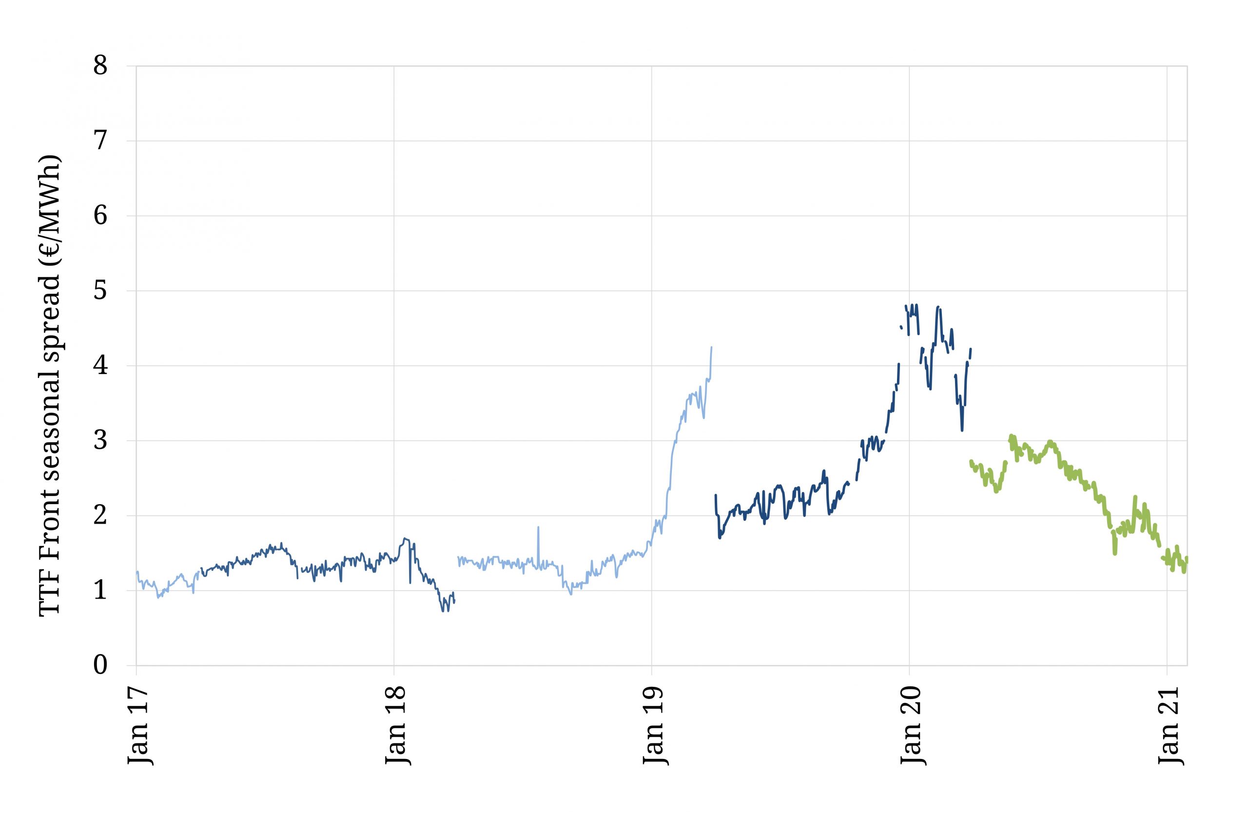 Chart 2 shows the recent evolution of seasonal price spreads at TTF.
