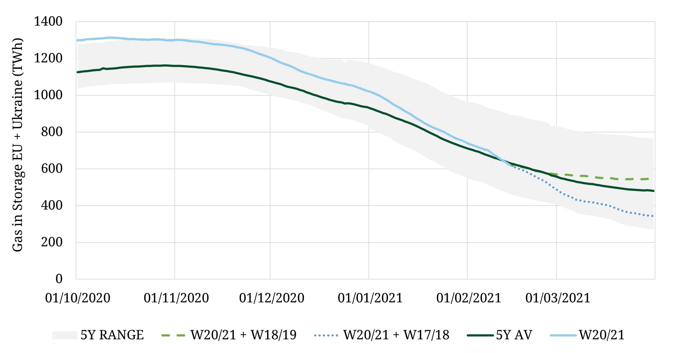 Europe entered Winter 2020-21 with inventories at 5 year highs as shown in Chart 1.
