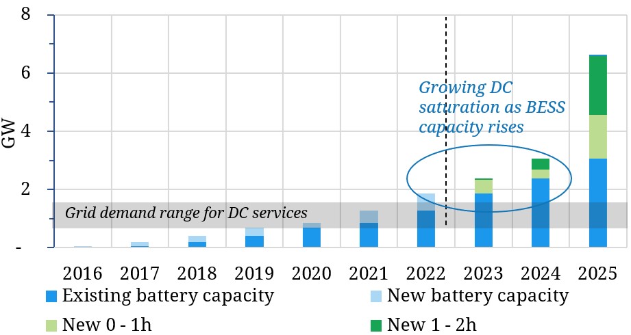 Evidence is however rapidly emerging that the DC market is nearing saturation as new BESS capacity comes online. This does not spell the end of strong returns. But it does mark the start of a rapid transition in the revenue stack away from ancillary services towards energy arbitrage across wholesale & balancing markets.