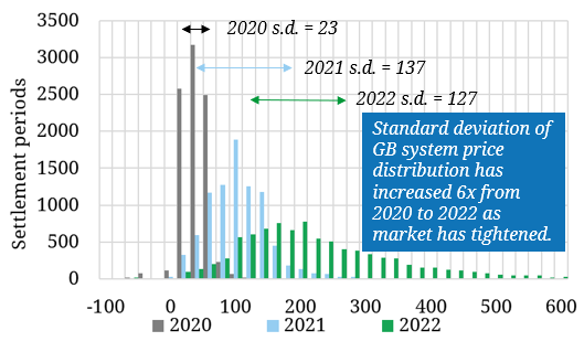 BM revenues are set to play a much more structural role in driving the BESS revenue stack as DC becomes saturated. The reason for this is illustrated in Chart 2 which shows the evolution of Summer system price distributions across 2020-22.