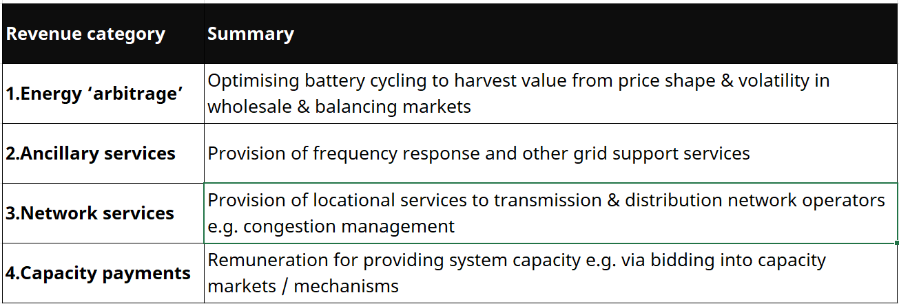 In order to understand why BESS investment momentum is growing so rapidly, it is useful to recap 4 key categories of revenues that drive BESS returns, summarised in Table 1.