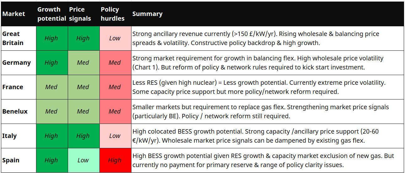In Table 3 we set out a concise summary of the BESS investment opportunity landscape, with a colour code ranking of 3 factors across 6 key markets.