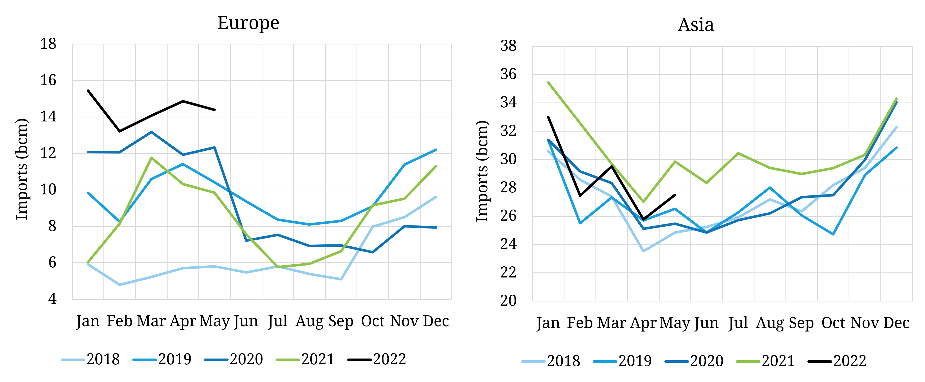 LNG imports have been balancing a very tight European gas market in 2022. Chart 1 shows European LNG imports surging this year (left hand panel). In order to attract incremental LNG cargoes, European buyers are driving up prices to attract supply from Asia (right hand panel).