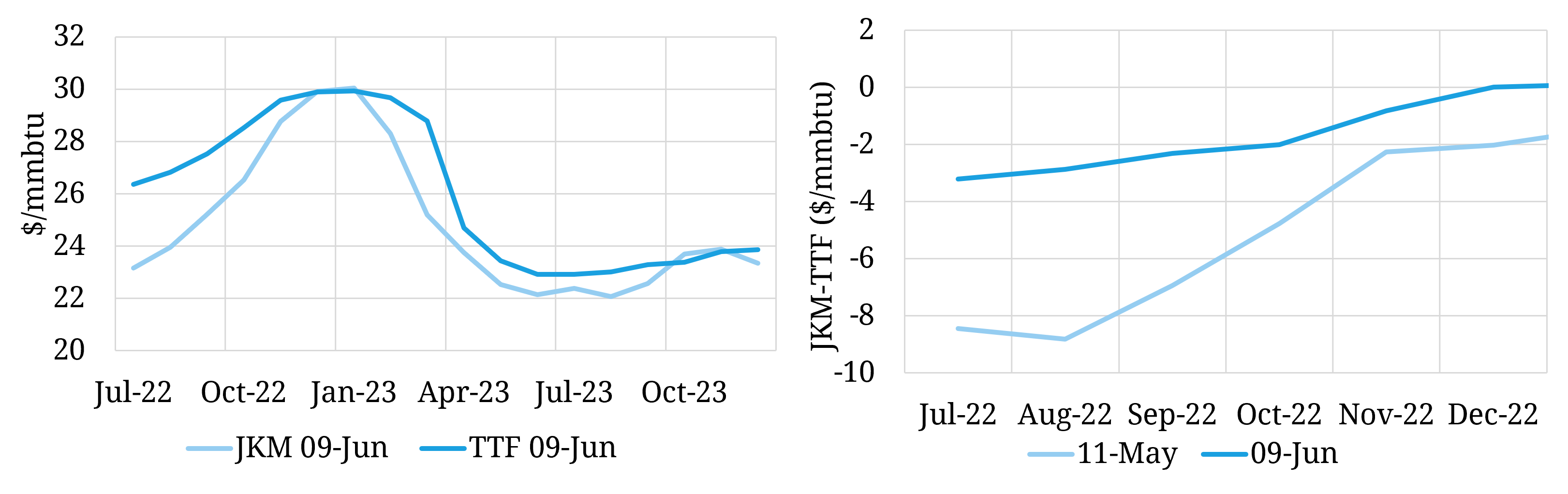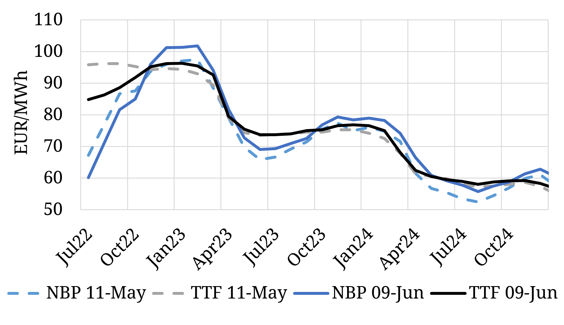 Chart 4: NBP vs TTF forward curves in early May vs early Jun