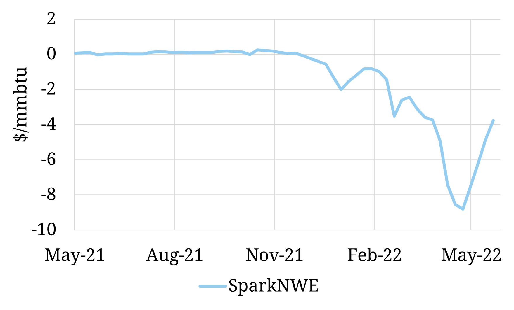 The chart shows this discount also easing across the last month as LNG imports into NW Europe have declined. The discount on a forward basis next winter is a narrower 1-2 $/mmbtu.