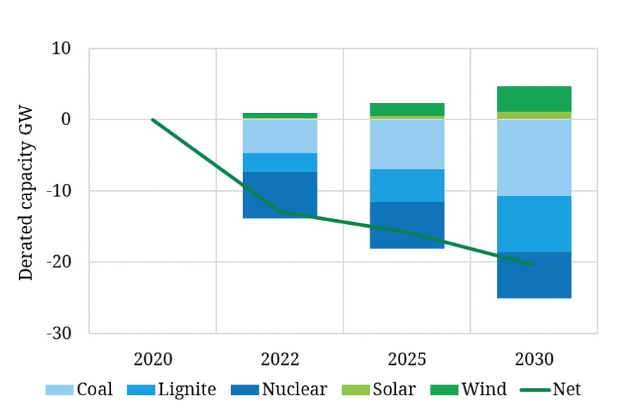 Set against this growth in intermittent generation is a rapid reduction in installed firm capacity. 16GW of nuclear, coal and lignite closures are scheduled by the end of 2022, 29GW by 2030.