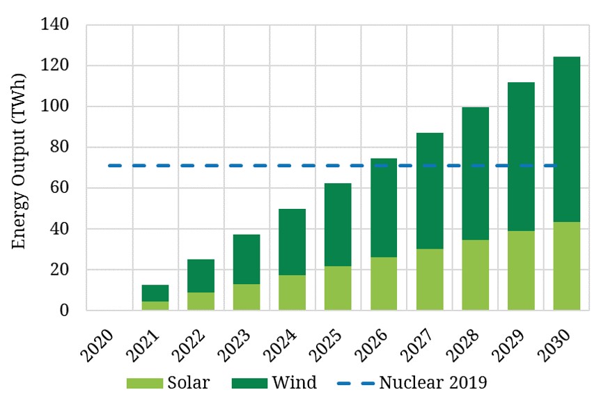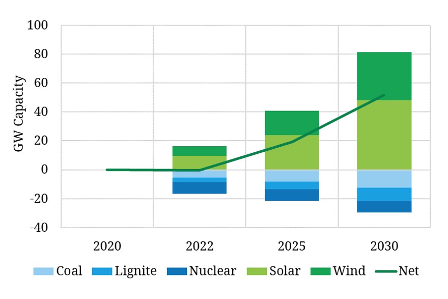On an energy basis, we also see some changes ahead. In 2019, nuclear generation accounted for 71TWh of generation, with coal and lignite generating 149TWh. By 2022, assuming linear progression towards 2030 renewables targets, we would expect to see an additional 8TWh of solar generation and 16TWh of wind generation.