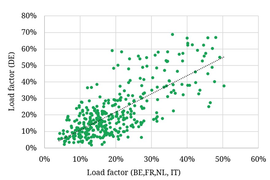 Chart 4 below plots the daily German onshore wind load-factors for the entire onshore wind fleet against the average wind load-factors in France, Italy, Belgium & the Netherlands, with each dot representing one day’s average load-factor. As we can see, there is a strong correlation between Germany’s wind load-factors and its neighbours.