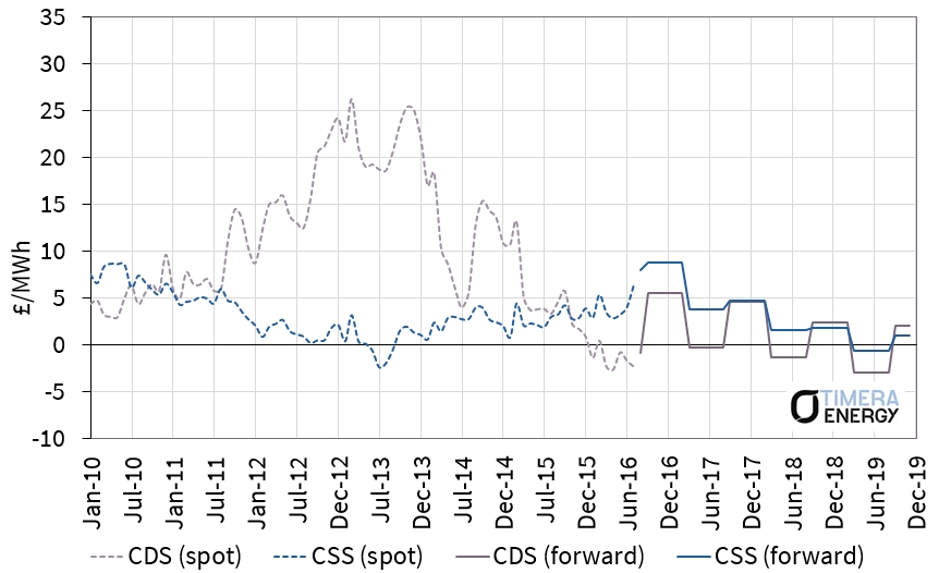 While these dynamics are an interesting short term phenomenon, there is a more important structural change taking place with spark spreads. The recovery in spot CSS across the summer has been accompanied by an increase in forward CSS, particularly for the coming winter (16/17). Winter CSS is now trading around 9 £/MWh, with average forward spark spreads over the next 12 months rising above 6 £/MWh. These levels represent a return to CCGT margins not seen since early this decade.
