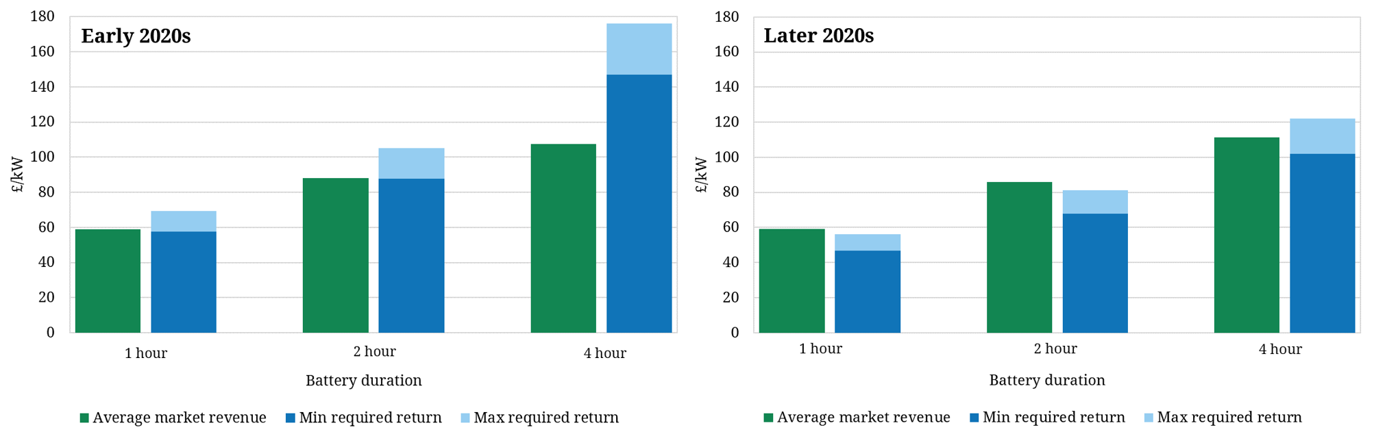 The left hand panel of Chart 1 provides an overview of UK grid connected battery economics by duration in the early 2020s.