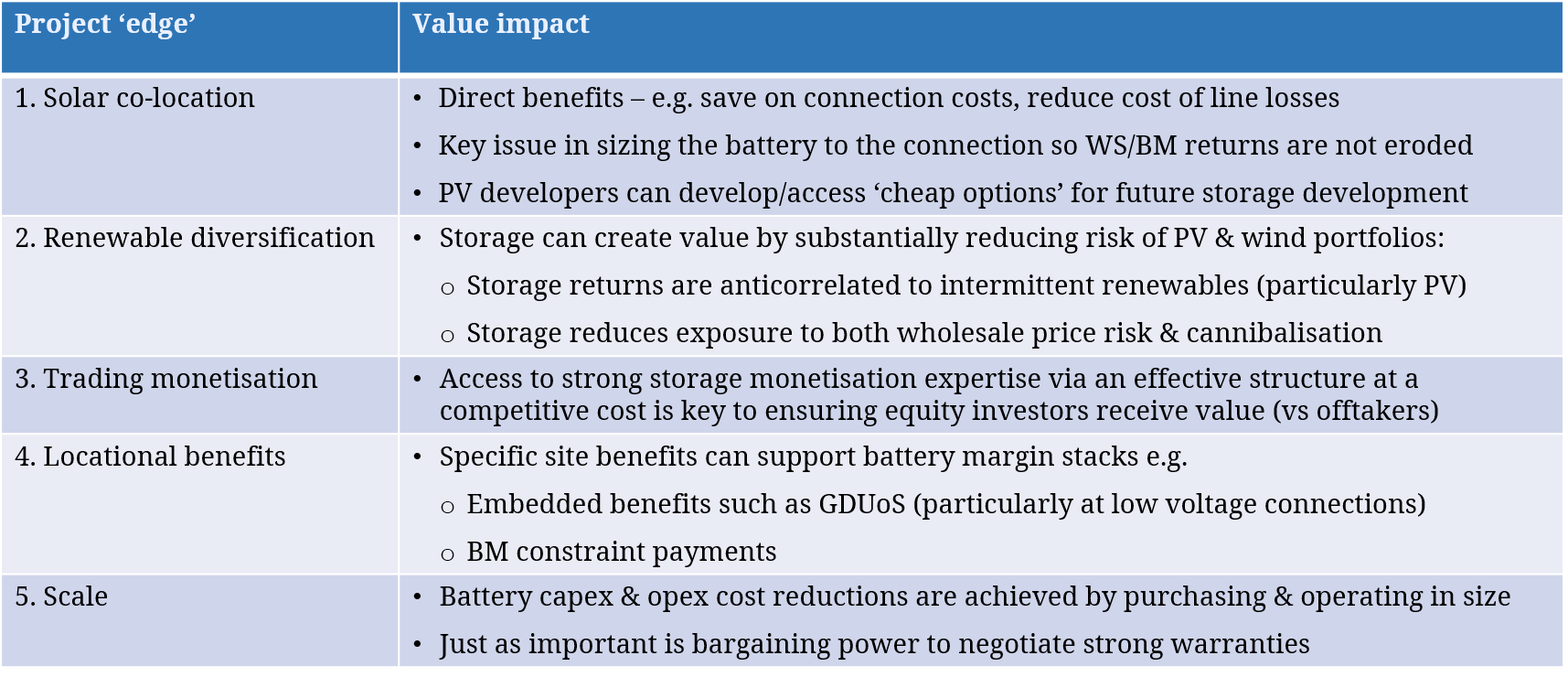Chart 1 illustrates how battery investment case viability is currently still marginal. So how is it that hundreds of MW of UK batteries are passing Final Investment Decision? Some form of ‘edge’ or advantage is required at a project level.