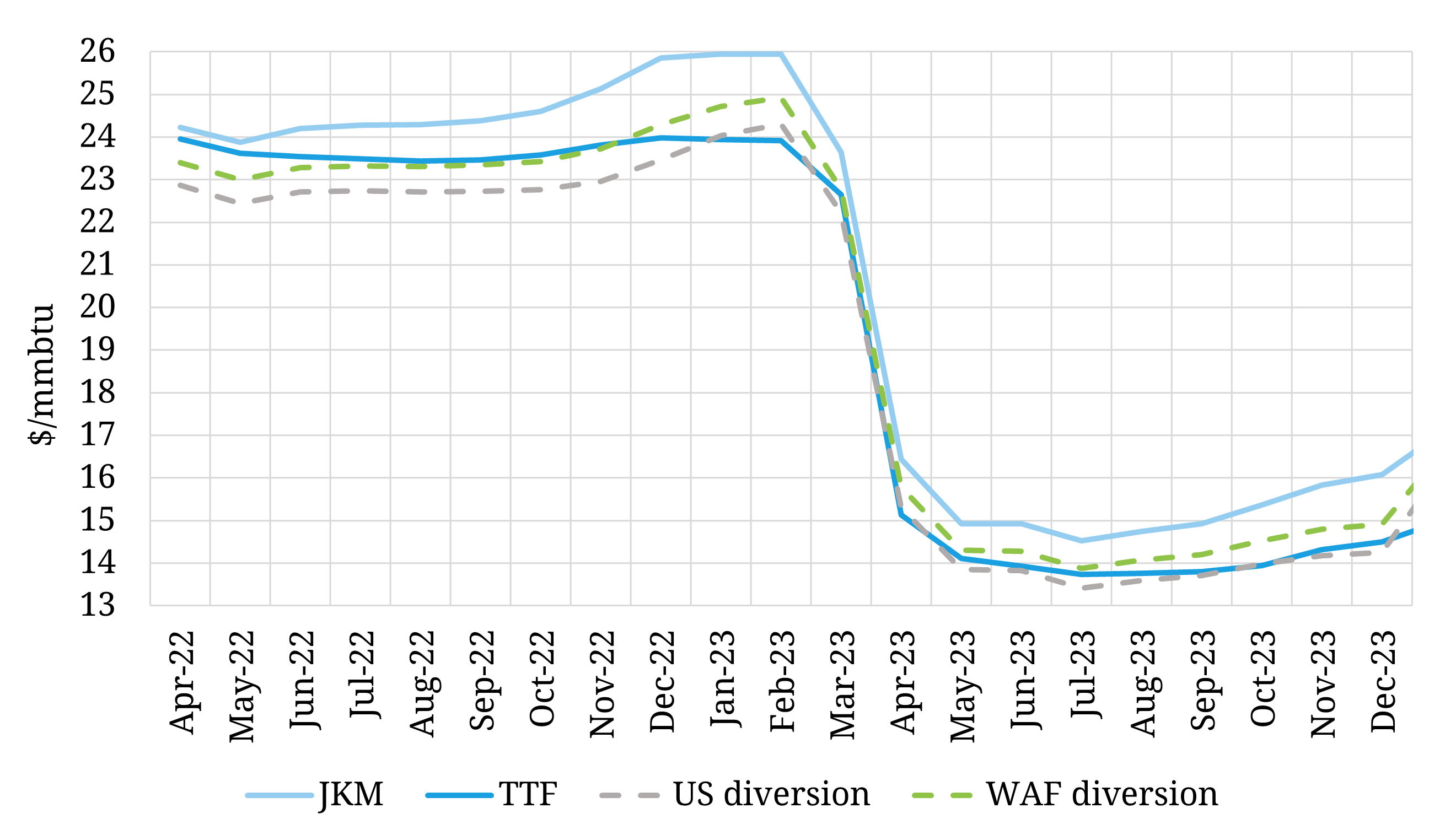 Chart 2: TTF & JKM forward curves vs diversion price levels