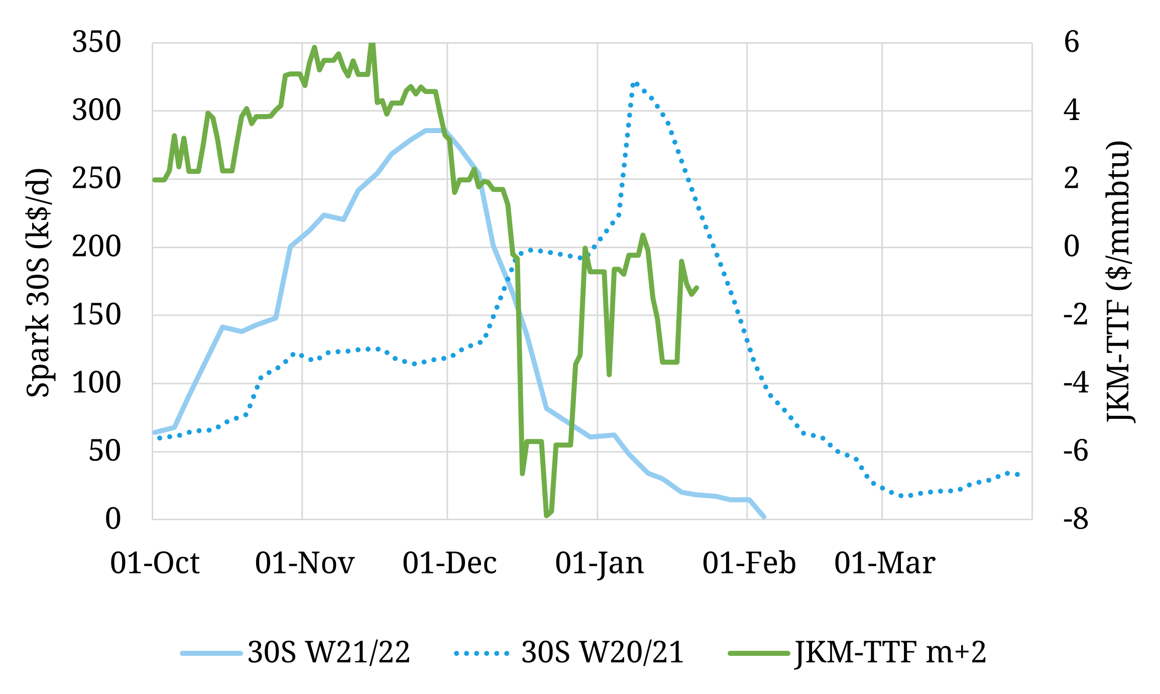 A mild Asian winter combined with healthy levels of contract cover has seen Asian LNG demand crumble. This has driven winter JKM prices well below TTF signalling the redirection of surplus LNG supply towards Europe.