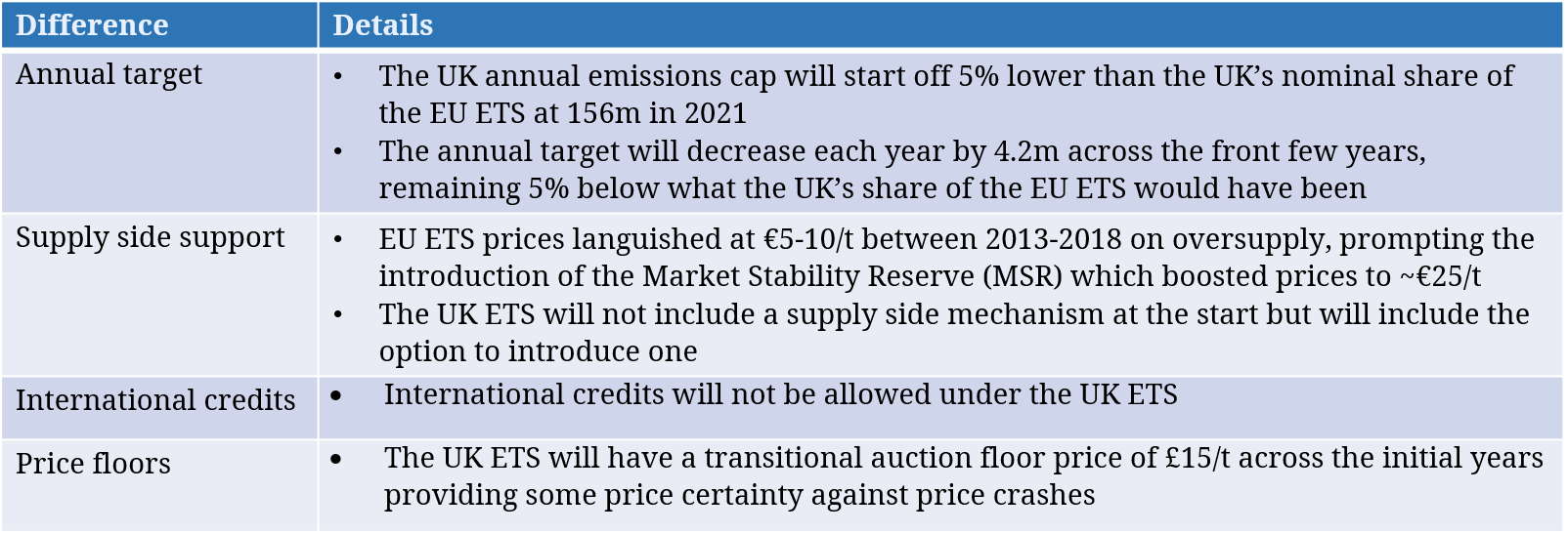 The UK ETS is based around the design of the EU scheme. The UK government sets an annual emissions target which decreases over time. Emitters must then procure carbon certificates to cover their emissions via auctions or secondary trading. There are however a few key differences to the EU scheme as summarised in Table 1.