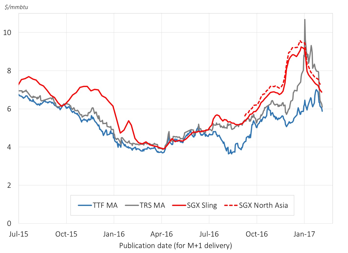 Chart 1 shows the evolution of prices in Asia versus European hubs in Q4 2016, relative to recent history. We have used Singapore Exchange (SGX) spot price data to show Asian spot LNG benchmarks (the Singapore and North Asia indices).